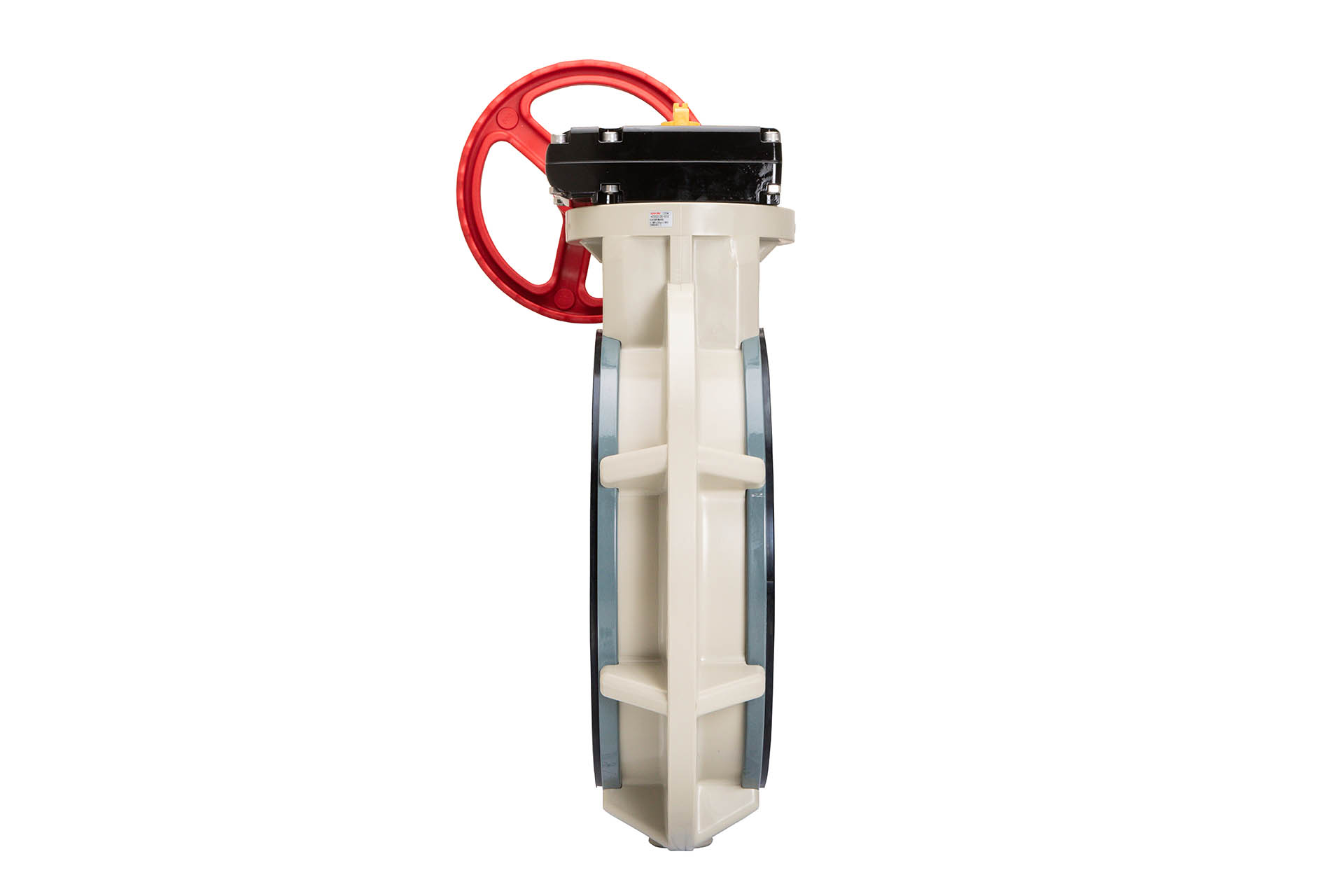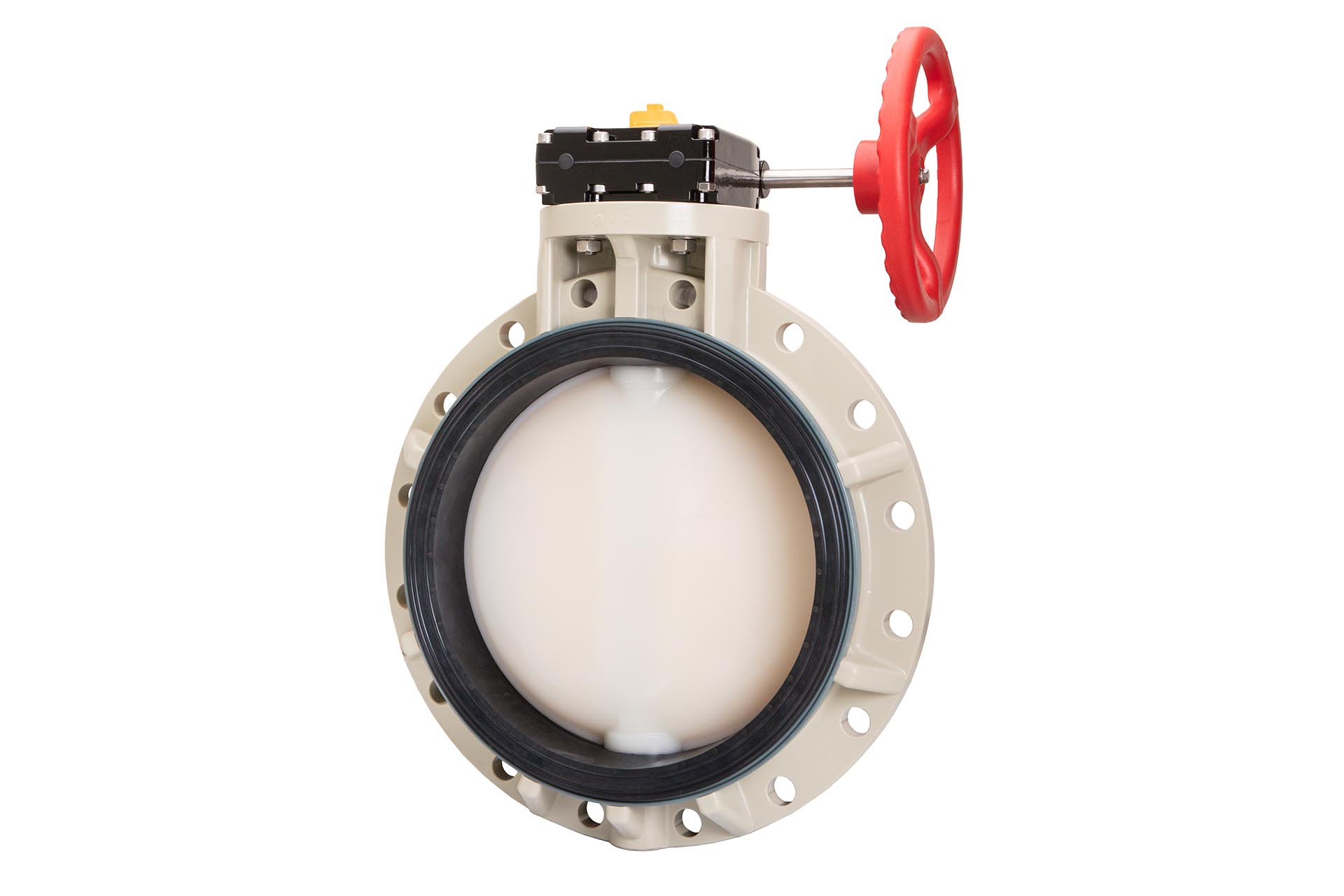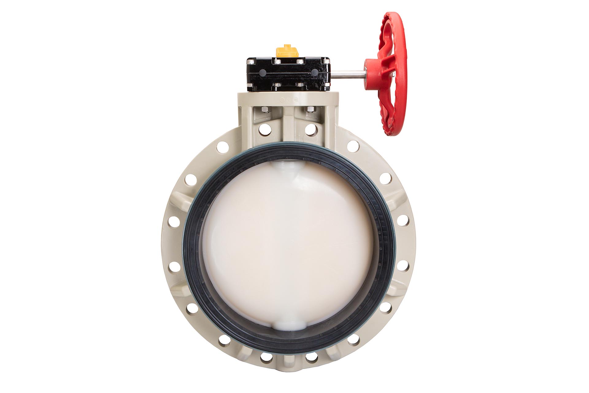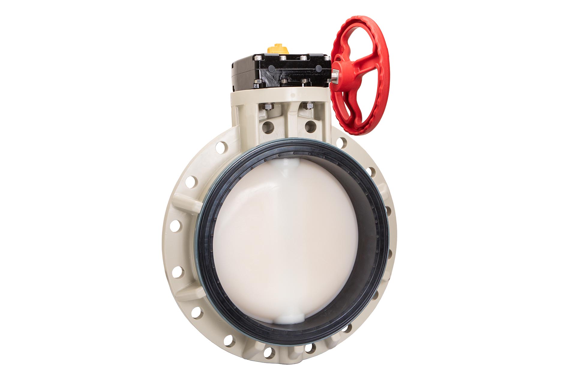 The Type 56 (DN400) valve is a quarter-turn valve with equal percentage type flow characteristics. This valve is ideal for chemical processing and wastewater applications and has the advantage of a robust construction with a one-piece body and a full-plastic gear box. Strong sealing on the elastomer seal in both flow directions is ensured. It provides moderate flow control and therefore can be used for both on/off and modulating service.